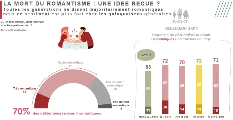 « Le moins qu’on puisse dire est que la métamorphose post-metoo des relations hommes-femmes ne porte pas pour l’instant un coup fatal à la romantisation du couple : le besoin d’entourer les relations de passion et d’imagination s’exprimant toujours par un fort besoin de romantisme aussi bien dans la phase de construction que d’entretien du couple. Et si les jeunes semblent un peu moins sensibles au script classique du modèle d’amour romantique, le couple dans sa version idéalisée reste un horizon rêvé pour la grande majorité de la GenZ ».