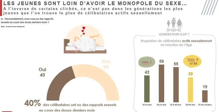 « Force est de constater que les jeunes n’ont pas le « monopole du sexe » et ceci aussi bien dans les corps que dans les esprits. Car contrairement aux idées reçues qui voudraient que les célibataires soient forcément soumis à l’abstinence à partir d’un certain âge, cette étude confirme le maintien d’une vitalité sexuelle chez les personnes ne vivant pas en couple après 50 ans. Il faut dire que notre « silver génération » – moins exposée aux écrans – est sans doute moins affectée que les plus jeunes par la baisse générale de l’activité sexuelle, et qu’elle se sent souvent plus libre et décomplexée que dans le passé, signe qu’elle est aussi touchée par l’évolution des discours et des normes sur ces sujets ».