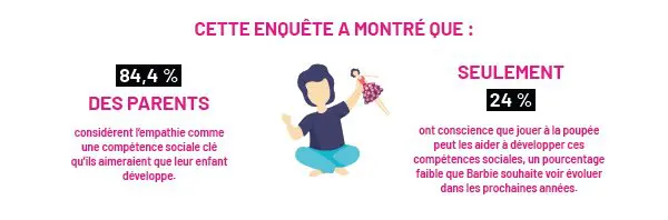 Barbie et des neuroscientifiques de l’université de Cardiff ont collaboré ensemble pour réaliser une étude neuroscientifique qui a démontré que le jeu à la poupée développe des compétences sociales et émotionnelles chez les enfants comme l’empathie. Cette qualité est déterminante pour la future réussite émotionnelle, scolaire et sociale des enfants. Convaincue que c’est grâce à de petits gestes de bienveillance et d’empathie que l’on peut contribuer à changer le monde, cette année Barbie va plus loin. Barbie lance un projet qui encourage l’empathie et l’inclusion ! Pour illustrer ce travail de recherche par des actions concrètes, la marque lance le B Kind Projet qui a pour but de développer l’empathie chez les enfants par des actions simples du quotidien.