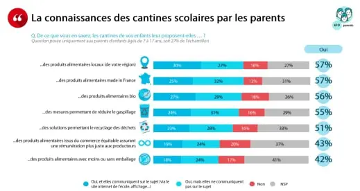 Cette incertitude peut s’expliquer par le manque de communication des établissements à cet égard : près d’un tiers des parents ignore si l’école de son enfant lui propose à la cantine des produits locaux (27%), made in France (31%) ou encore issus du commerce équitable (37%).
