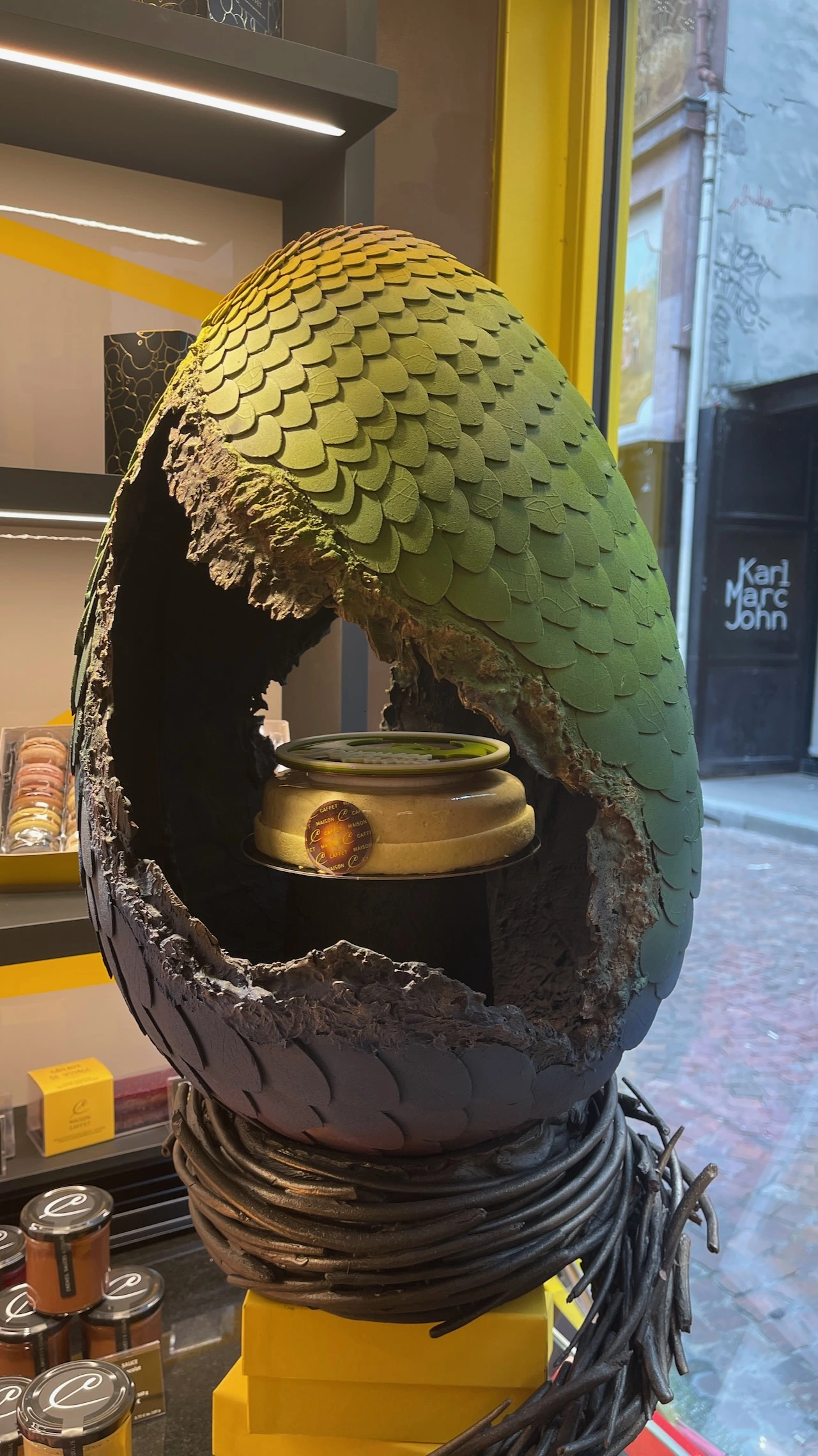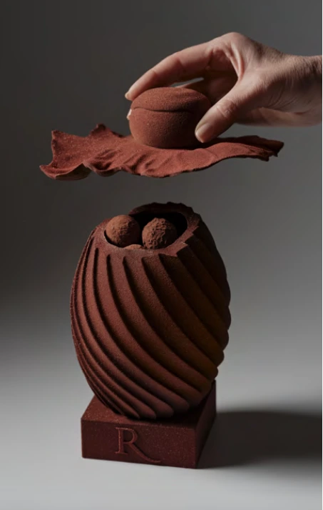 La Poupoule aux œufs d’or dépasse le simple cadre du chocolat : c’est une pièce sculpturale, presque hypnotique, produite en édition très limitée. Une œuvre que l’on regarde avant même d’oser la casser.