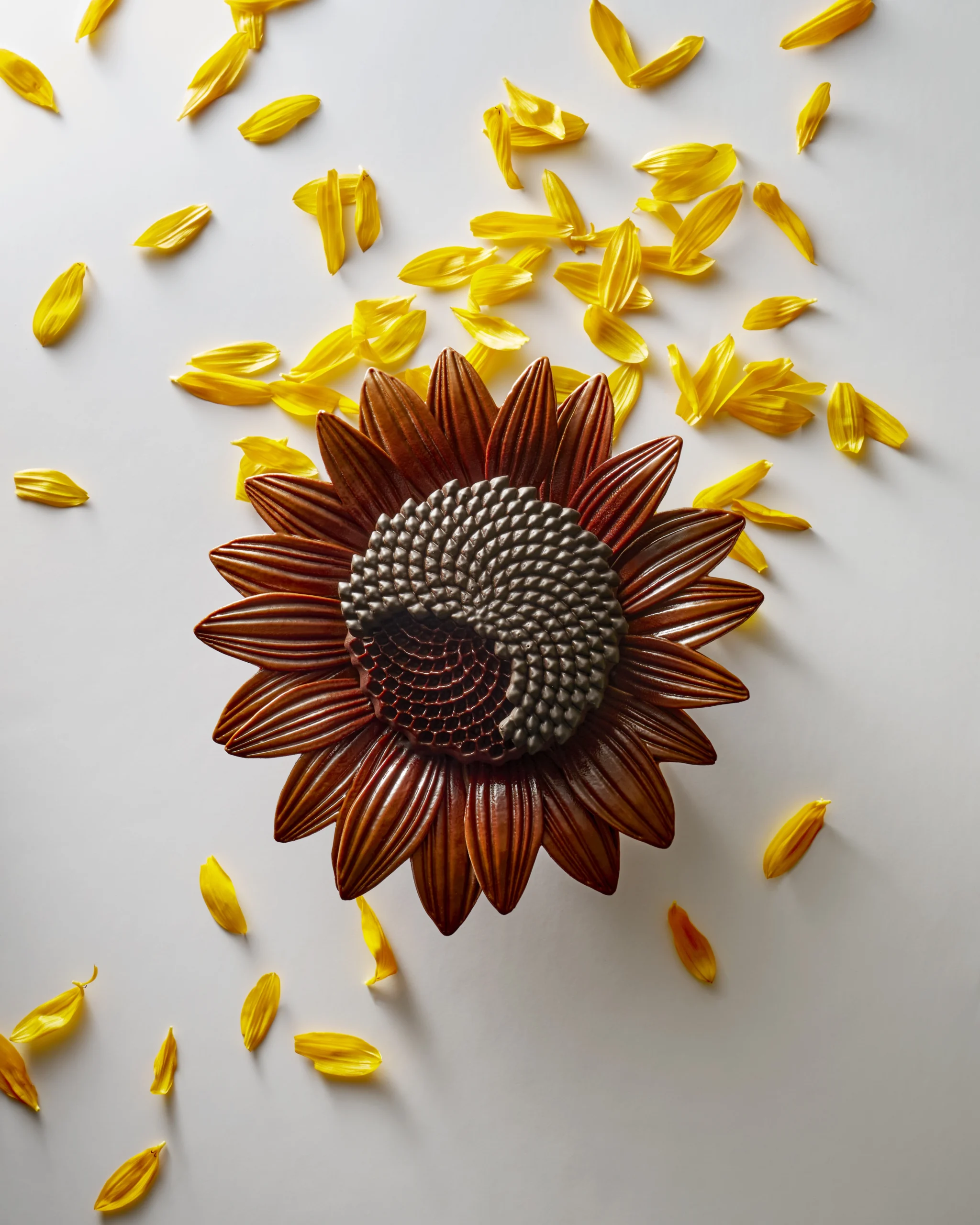 Un tournesol en chocolat dont chaque pétale se détache, presque comme un rituel. À l’intérieur : guimauve à la vanille de Tahiti, praliné graine de tournesol, croustillant délicat.