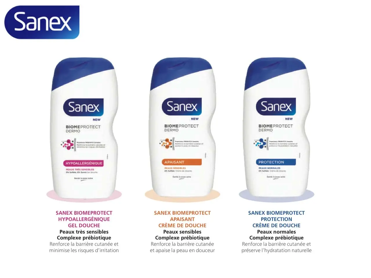 Les produits Sanex BiomeProtect sont munis d’un complexe TRIPLE-BIOTIQUE qui renforce la barrière cutanée de la peau en la protégeant des agressions extérieures et en améliorant son hydratation. Il aide votre microbiome à se renforcer en nourrissant les bonnes bactéries tout en ciblant les mauvaises. Pour en savoir plus, sur la gamme Sanex BiomeProtect, rendez-vous sur sanex.fr