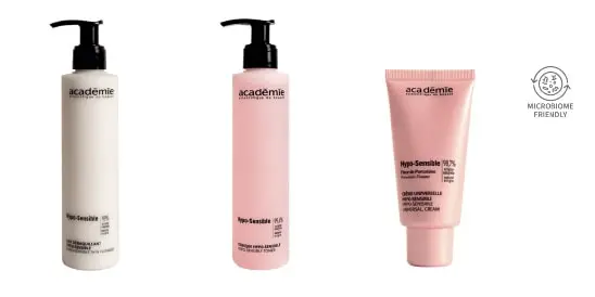 Lait démaquillant, Tonique et Crème universelle d’Académie – A l’extrait de Fleur de Porcelaine, cette gamme permet de renforcer la barrière protectrice des peaux sensibles (le microbiome) et d’apaiser intensément la sensibilité des peaux réactives grâce à des formules minimaliste et sans parfum.