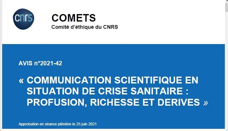 Le Comité d’éthique du CNRS, le COMETS, a publié il y a quelques jours un avis très attendu sur les dimensions déontologique et éthique de la crise sanitaire. Il tranche, par sa franchise et la précision de son propos, avec les communiqués parfois sibyllins des directions des institutions scientifiques devant les dérives de certains chercheurs et médecins. Comme ce désormais célèbre communiqué de la direction du CNRS s’élevant contre des pratiques anti-déontologiques et in-éthiques de l’un de ses sociologues… qui tournait à la devinette. Mais, à qui pouvait bien s’appliquer ces condamnations sévères ??? Impossible de le savoir en lisant le texte qui ne comportait aucun exemple nominatif de ces dérives sévèrement condamnées. La devinette était facile, il s’agissait de Laurent Mucchielli, comme expliqué dans cette note du blog.