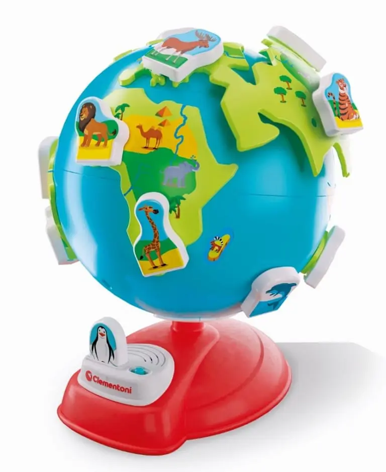 Ce globe de Clementoni, permet aux enfants à partir de 3 ans de reconstituer notre planète terre en ajouter les 6 continents et les 14 animaux au bon endroit grâce au module électronique situé en haut pour entendre le cri des différents animaux. Super pour apprendre la géographie !