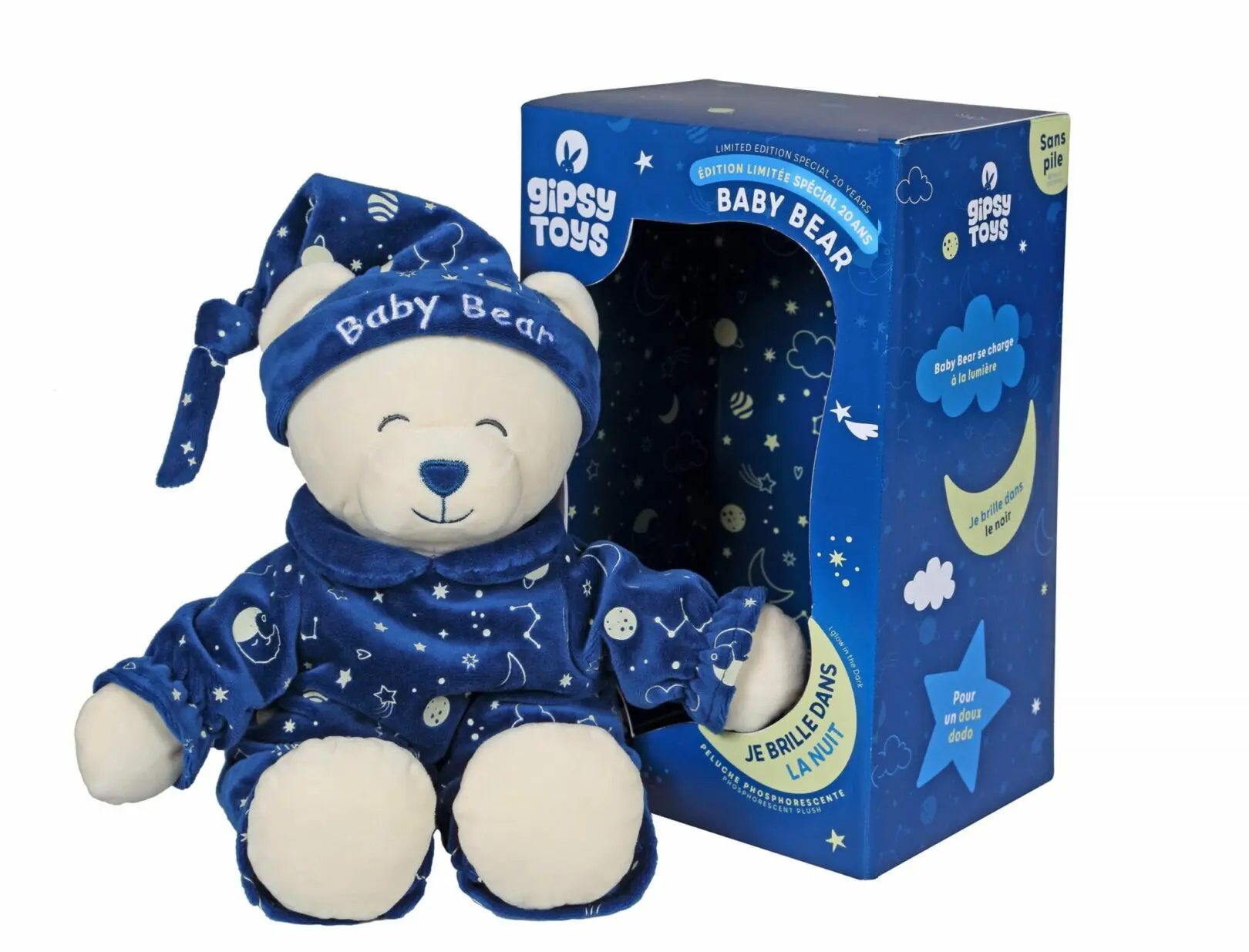 Pour les 20 ans du fameux Baby Bear de Gipsy Toys, une édition limitée voit le jour : Baby Bear Glow in the dark. Une peluche trop mignonne et toute douce qui se recharge à la lumière et brille dans la nuit…le compagnon idéal pour accompagner les rêves des touts-petits.