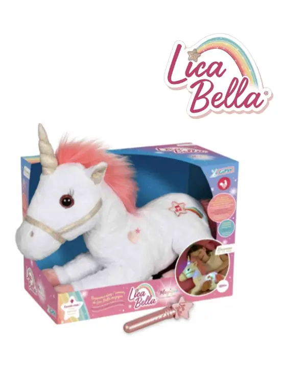 Plongez dans l’univers fantastique de Lica Bella, la star des licornes qui fait rêver toutes les petites princesses. Coup de cœur assuré pour cette adorable licorne en peluche toute douce à la crinière rose et aux touches pailletées.Placez la jolie baguette magique sur son cœur pour que la magie opère… Son corps et ses yeux s’illuminent alors au rythme de sons féeriques.