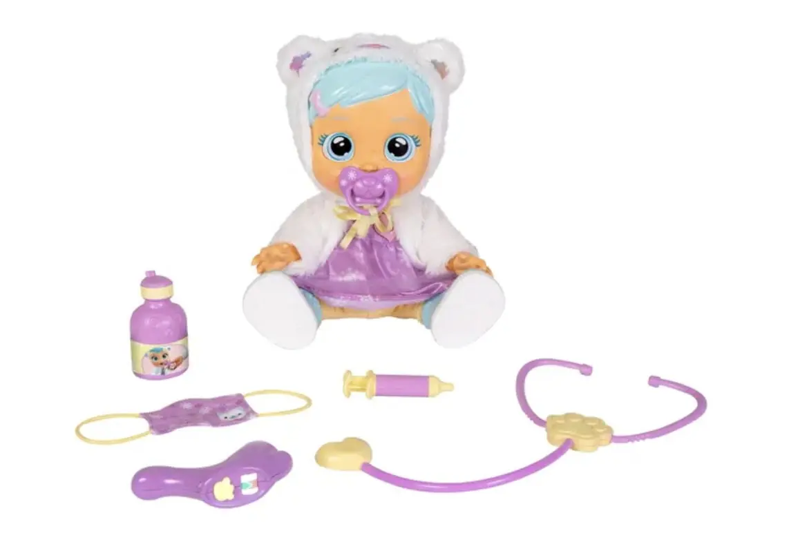 La poupée Kristal est malade :  il faut la soigner et prendre soin d’elle grâce à ses 7 accessoires interactifs. Si on lui retire sa tétine, elle se mettra à sangloter et à pleurer de vraies larmes. Elle possède 30 sons réalistes ! Une fois calmée, elle adorera que l’on coiffe ses jolis cheveux. Avec ses jolis yeux effet cristal et sa jolie tenue, elle va charmer de nombreux enfants.
