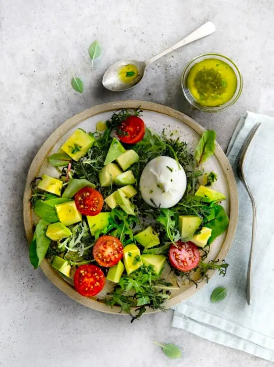 - Saupoudrez le mélange de salade sur 2 assiettes. Répartissez les dés d’avocat et les tomates sur la salade. Ajoutez les mini burratas. Arrosez la salade de la vinaigrette ou conservez la vinaigrette dans le pot pour l’utiliser juste avant de servir.