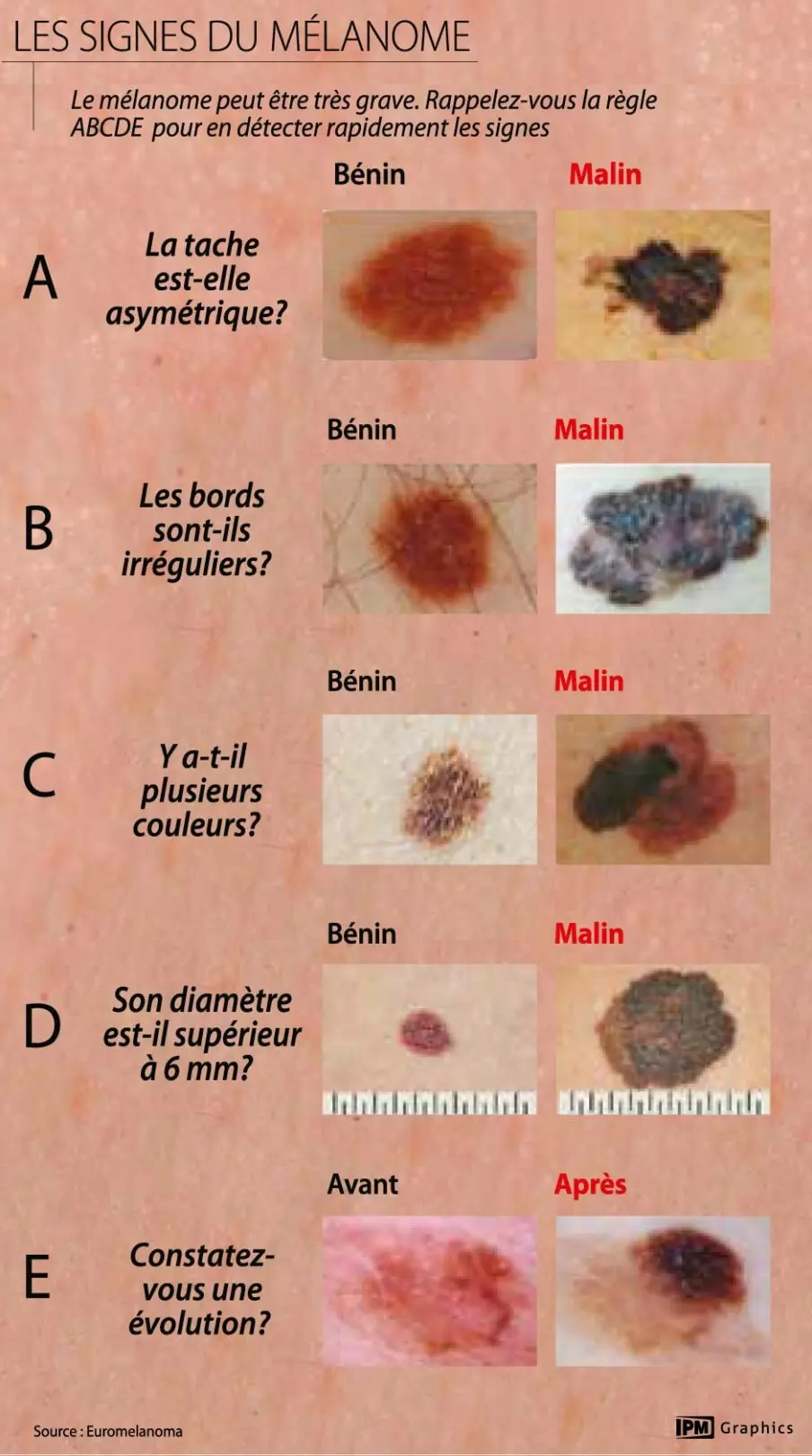 • Une tache sur la peau qui évolue = risque de mélanome. Exigez une consultation dermato en