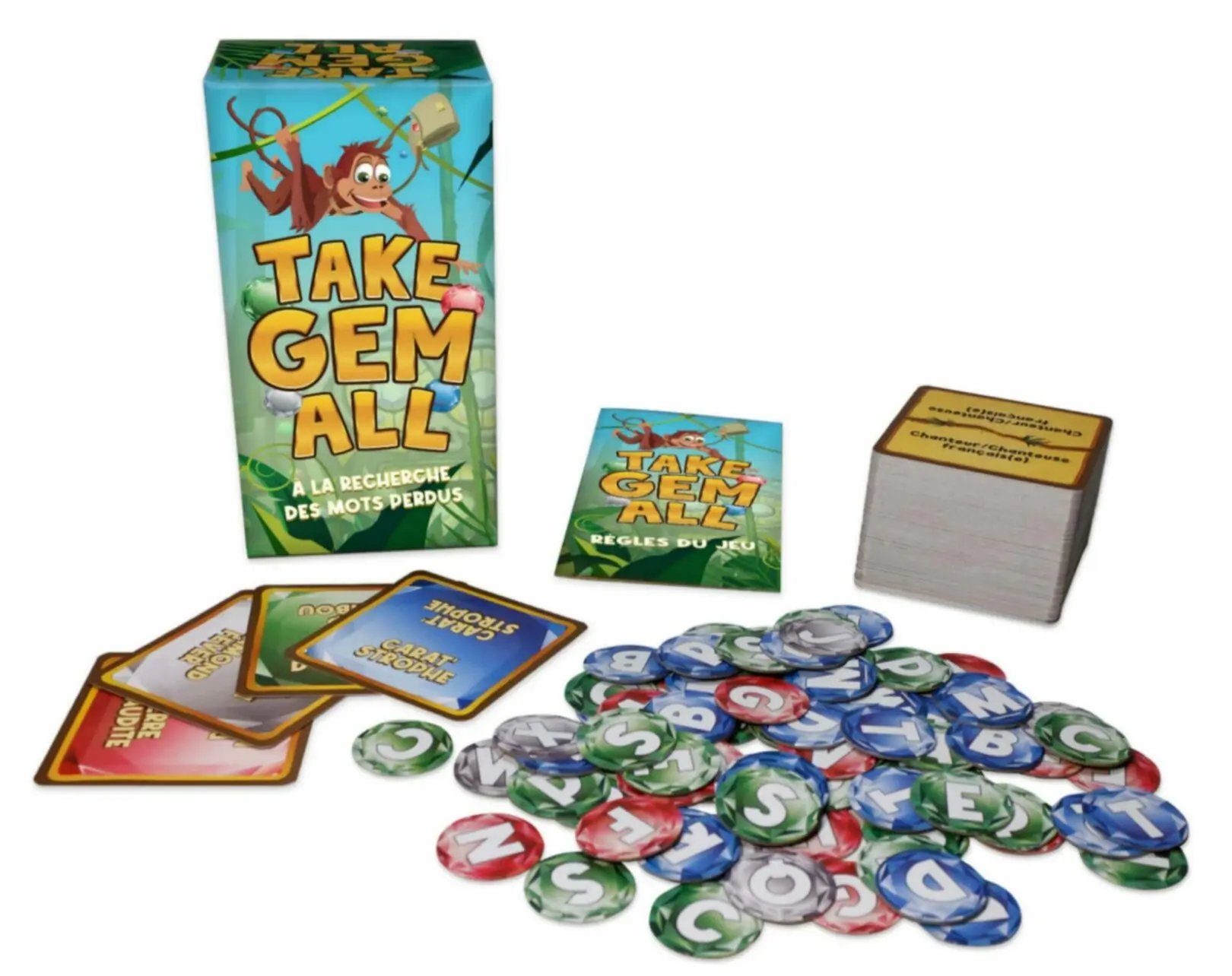 TAKE GEM ALL réinvente la mécanique du Petit Bac de notre enfance en proposant un univers de jeu enivrant, des thèmes inédits et un rythme endiablé. Le but de ce jeu d’ambiance est de s’emparer d’un maximum de pierres précieuses en étant le joueur le plus rapide à donner une réponse correspondant au thème joué et commençant par l’une des quatre lettres en jeu. À chaque thème joué, tel que « Nuance de bleu », « Chose qui sent mauvais » ou encore « Sur une pizza », le premier joueur qui donne une réponse correcte à voix haute gagne la manche et remporte la pierre précieuse de la lettre utilisée. Quel que soit votre âge, plongez au cœur de la jungle tropicale et partez à la recherche des Mots Perdus en famille ou entre amis. Convivialité et bonne humeur en perspective ! Un des jeux pour les vacances qu’on adore !