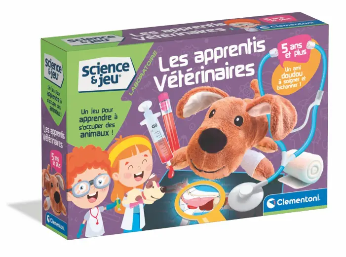 Ce jeu contient une peluche qu’il faut soigner avec les accessoires inclus : stéthoscope, bandages, pansements, radios et une collerette. Un tutoriel vidéo avec un amusant vétérinaire guidera les enfants dans toutes les activités proposées
