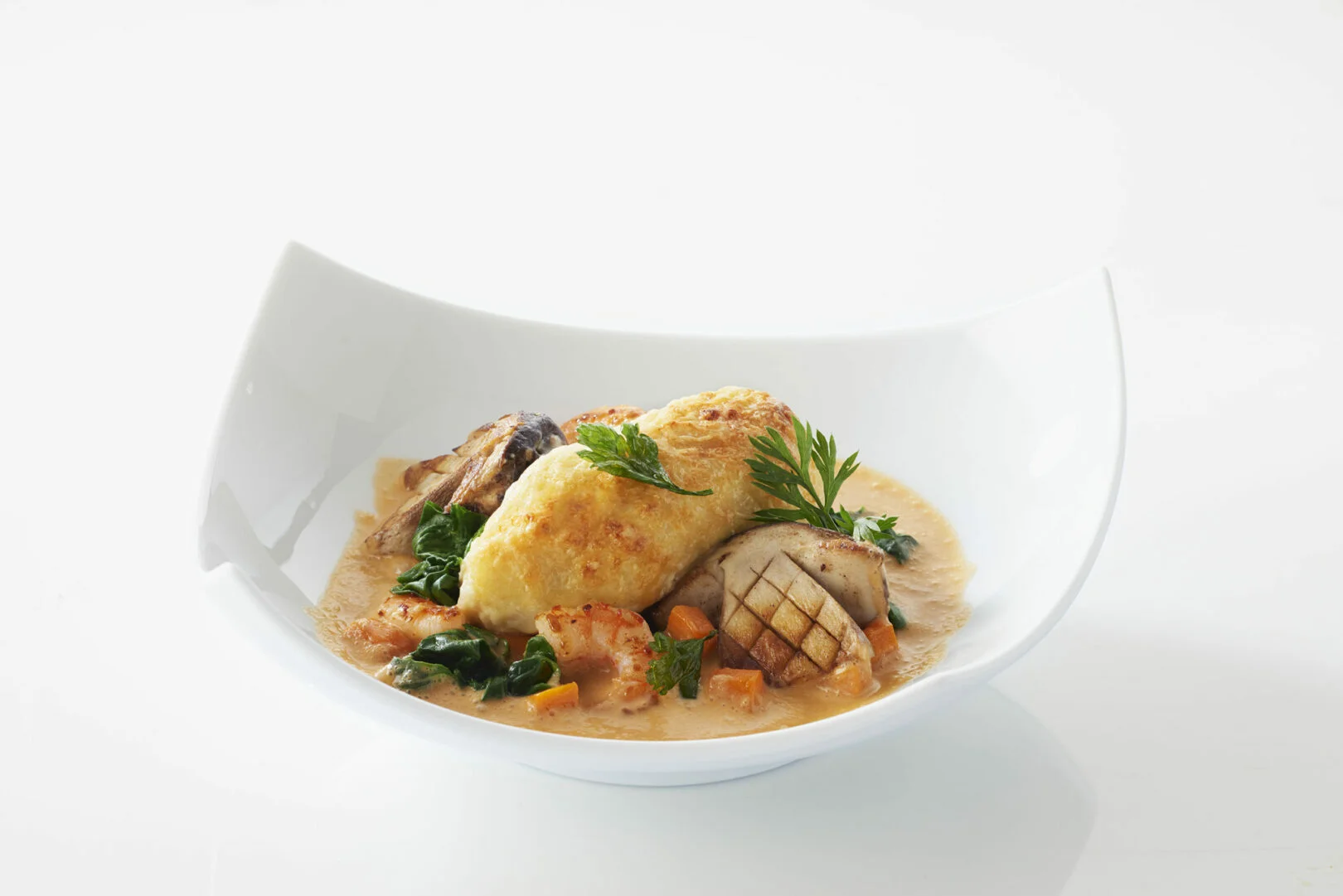 Dressage : Disposer au fond de l’assiette une cuillère de cubes de carottes, recouvrir partiellement avec les épinards, disposer au-dessus la quenelle rôtie et parsemer des deux côtés de cèpes rôtis et de 2 crevettes. Ajouter une petite louche de bisque de homard et décorer de la pluche de cerfeuil, celle de fane de carotte et de persil frit. Terminer par une pousse d’épinard et servir les quenelles.